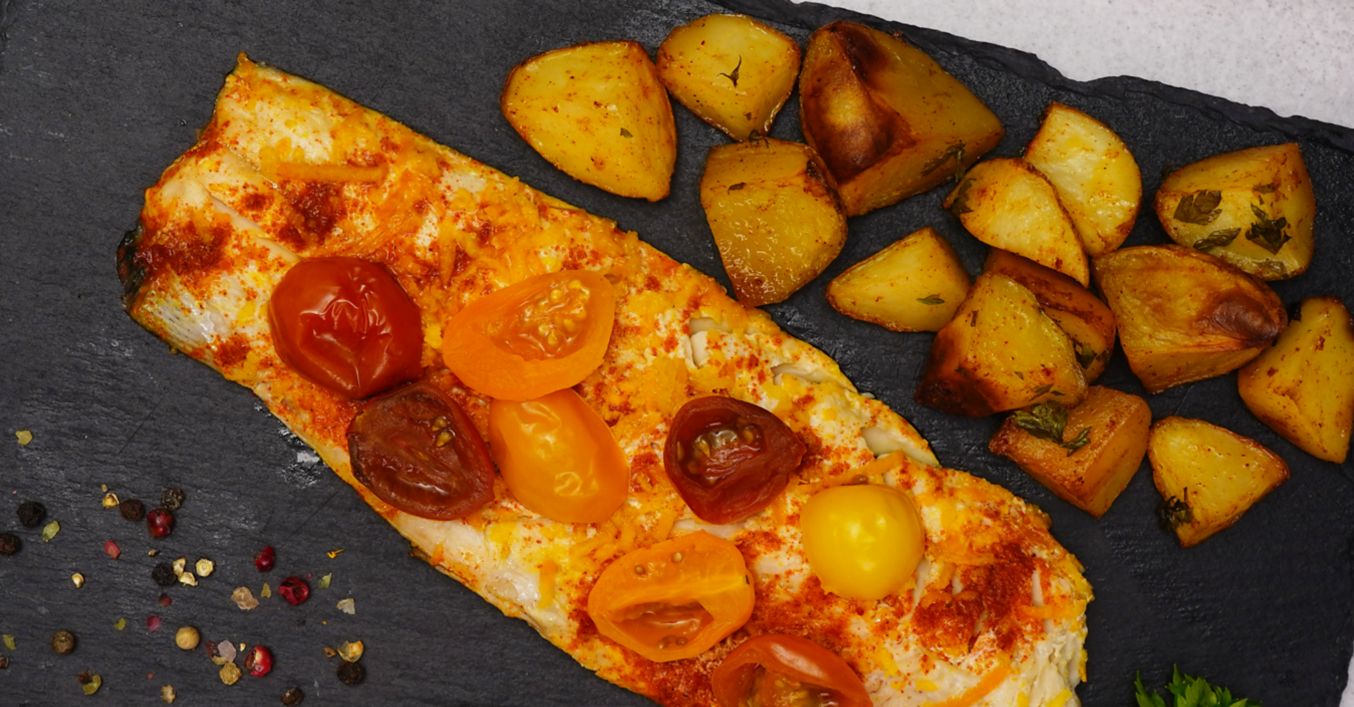 След като се изпече, рибата се изважда от алуминиевото фолио и се сервира с печените пресни картофи.