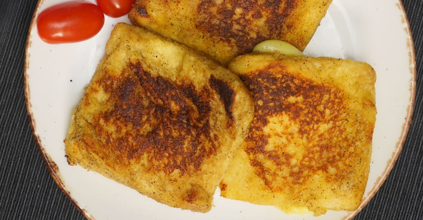 Отрязват се краищата на филийките, за да остане само меката част. Слага се парче топено сирене слайс по средата на една от филийките. Отгоре се поставят парче шунка и още едно парче топено сирене слайс. Покрива се с друга филийка и се притискат всички краища на двете филийки с пръсти, така, че да се получи джобче с пълнеж от шунка и топено сирене.