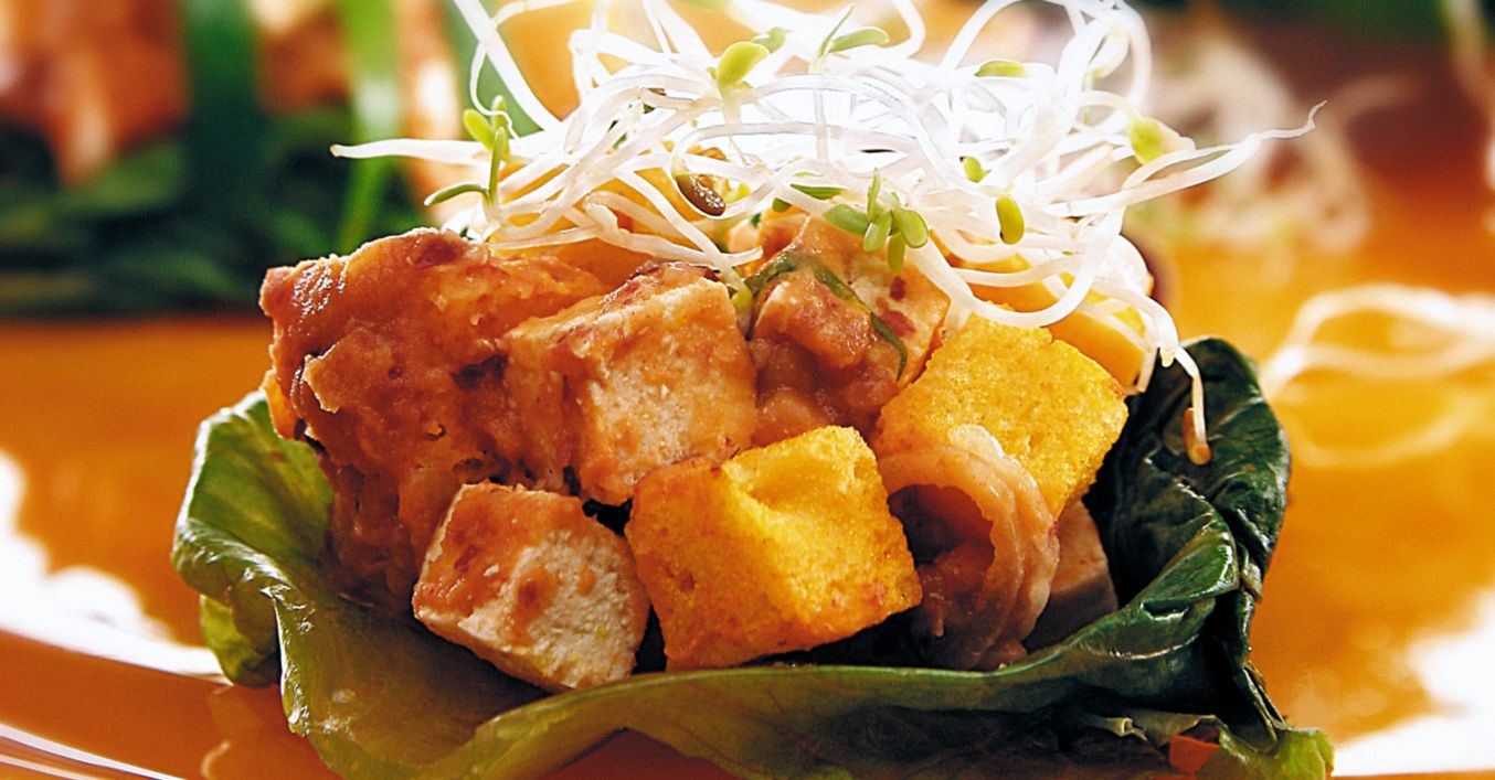 Прибавят се сусамовият тахан, нарязаното на кубчета тофу и половината наситнен див лук.