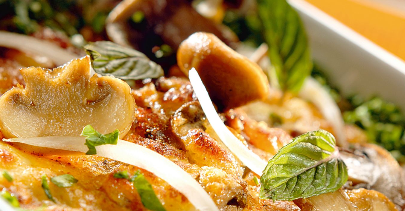 Пече се около 10 минути на горно нагряване в предварително загрята на 200-220°С фурна (докато се зачерви кашкавалът). Поръсва се с наситнения магданоз и се сервира.