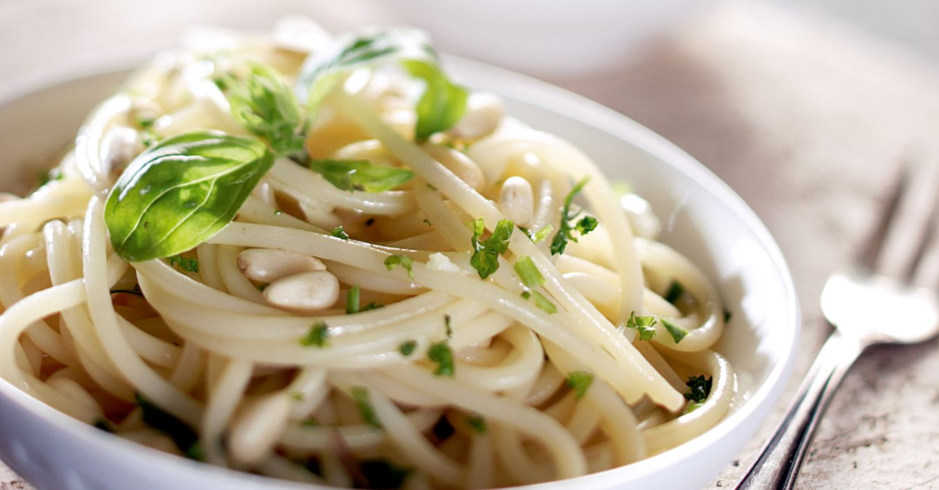 В тиган се сгорещява зехтинът за соса, слагат се спагетите, кедровите ядки и накълцаните чесън, магданоз и босилек. Разбърква се и след около 1-2 минути се добавя пармезанът. Овкусява се със сол и черен пипер и се сервира.