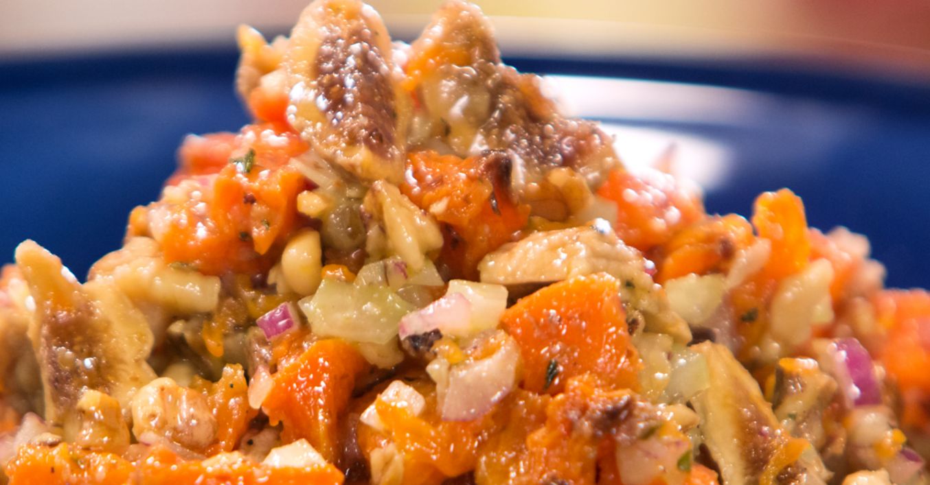 Тиквата, лукът, селърито, смокините и орехите се смесват. Салатата се овкусява с дресинга, разбърква се и се поднася.