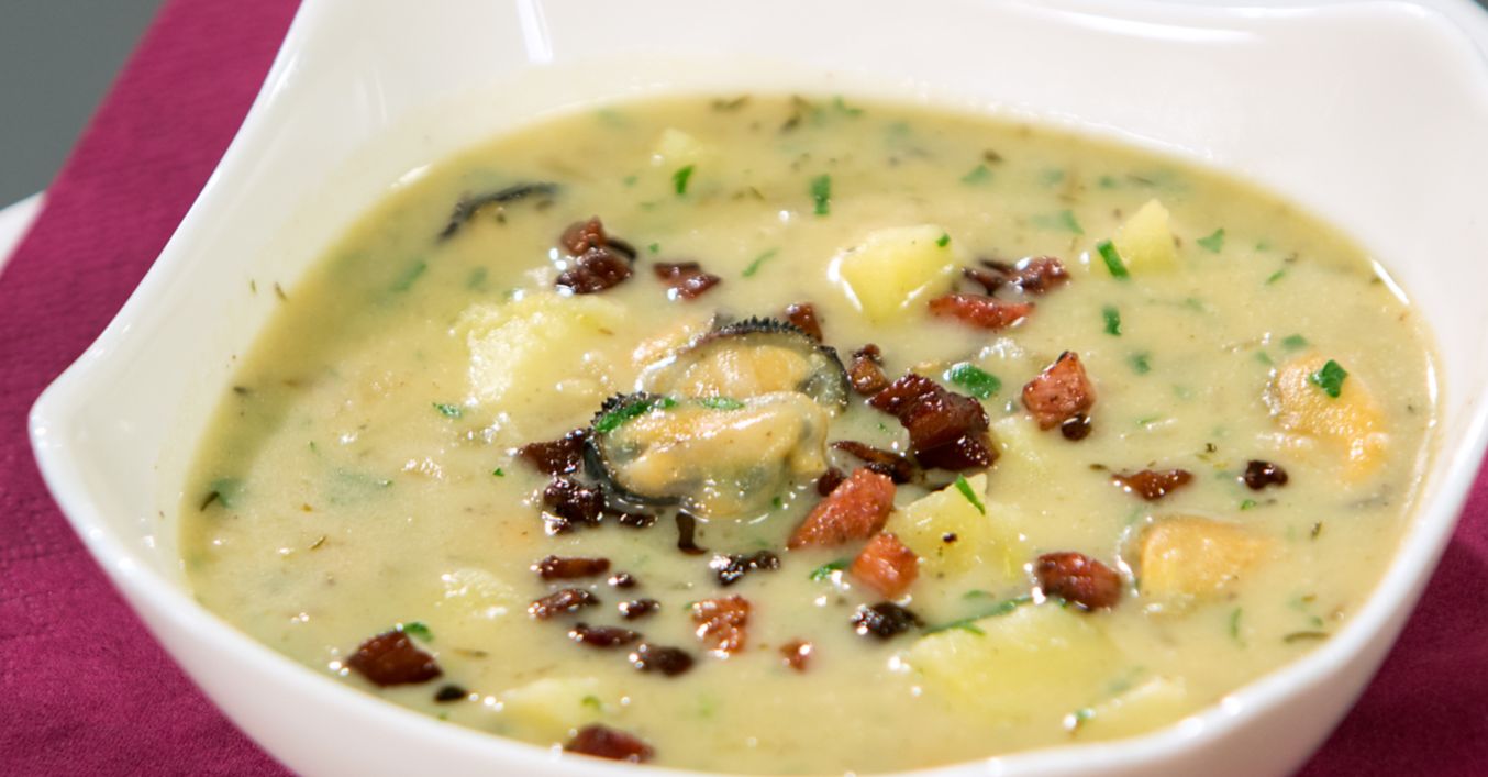 Картофеното пюре се разбърква със соса, който се е получил при готвенето на мидите. Добавя се малко вода, ако е необходимо, и се сипва през цедка в тенджерата при лука.