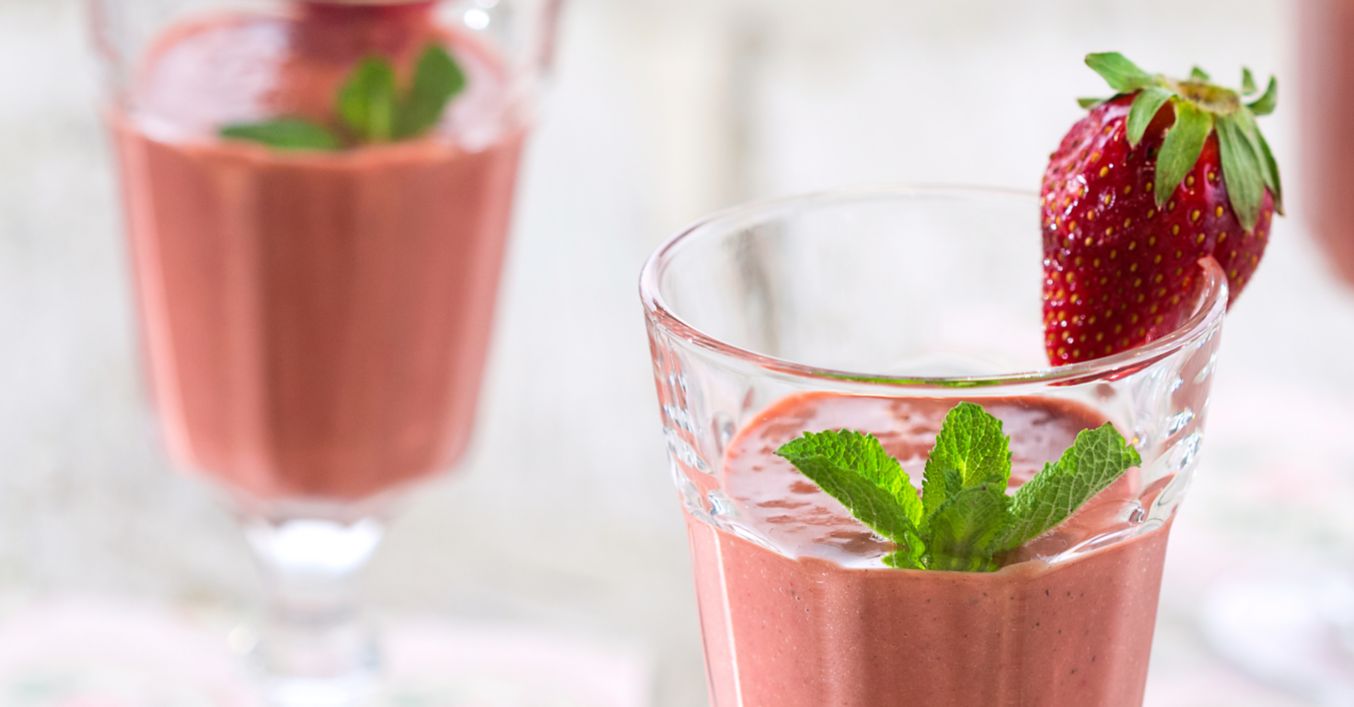 Смутито се налива в чаши и се сервира, украсено със заделените ягоди и листенцата мента.