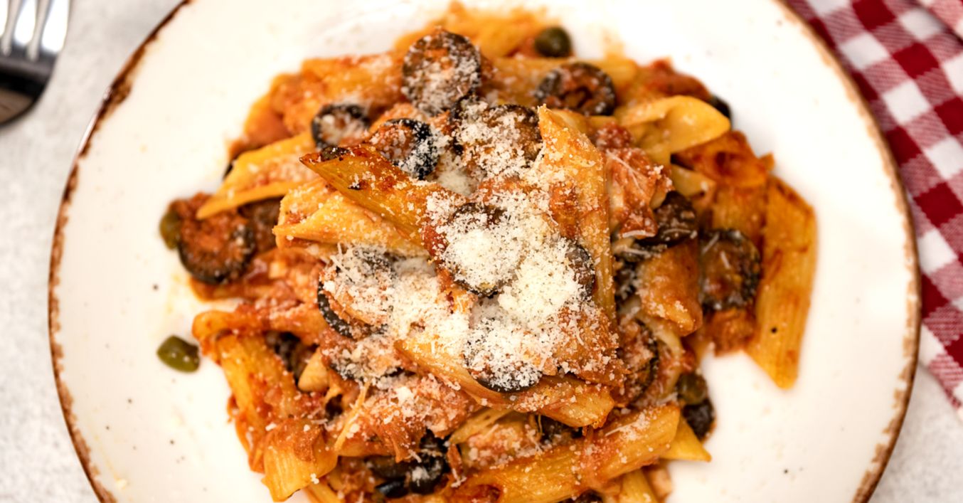 В голяма купа се смесват доматеният сос, рибата тон, маслините, чесънът, каперсите, щипка риган и 2 с.л. маслиново масло. Добавя се сварената пастa и се разбърква добре.