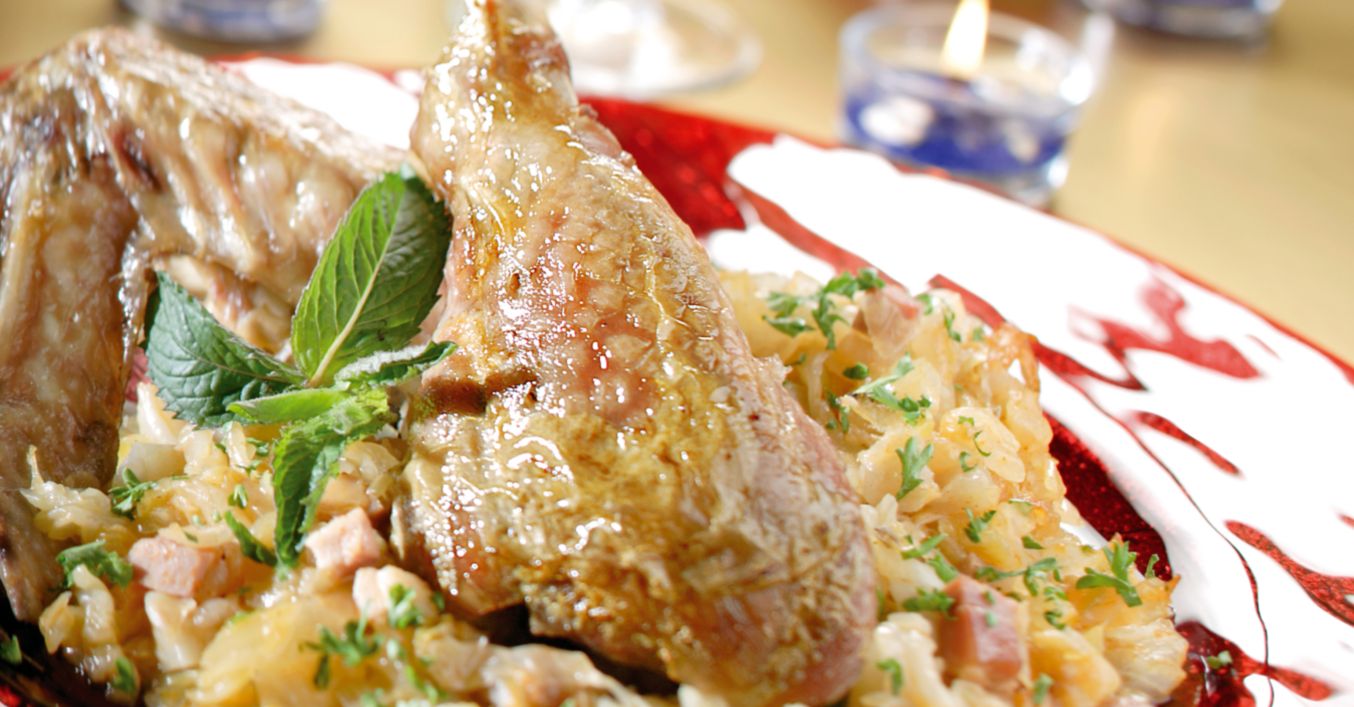 Зелето се нарязва наситно. Задушеният лук се подправя с червения пипер, добавя се нарязаното зеле и се налива част от бульона на пуйката.