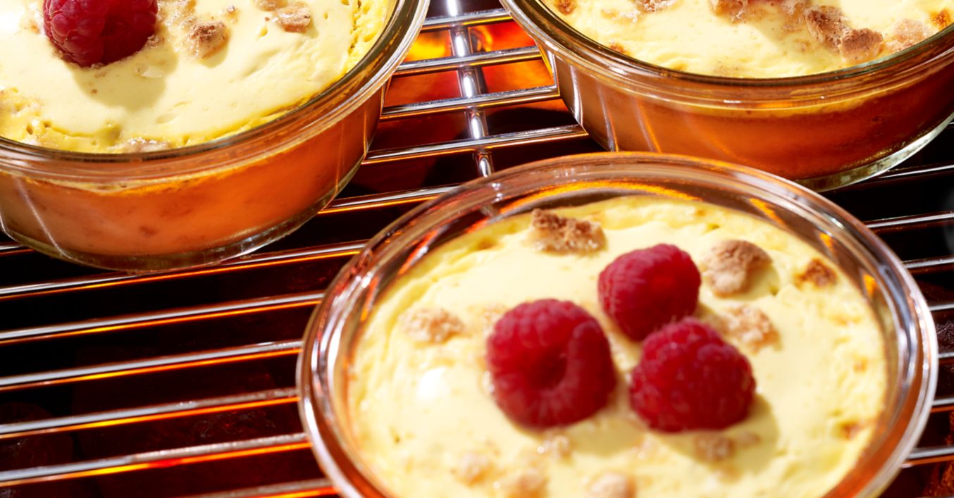 Амаретините се натрошават на ситно и се разпределят по дъното на четири огнеупорни чаши.